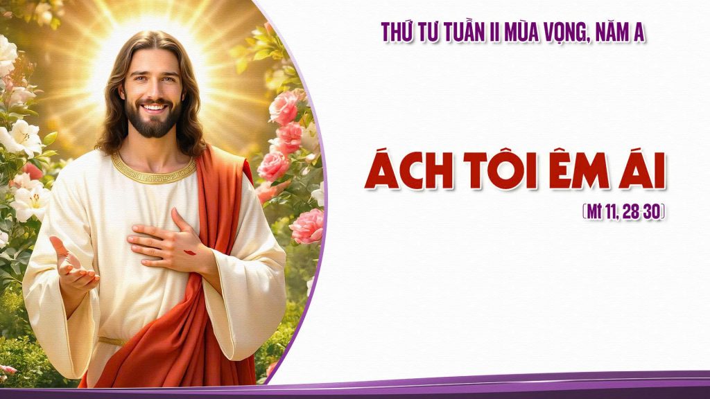 28 Khi ấy, Đức Giê-su cất tiếng nói : “Tất cả những ai đang vất vả mang gánh nặng nề, hãy đến cùng tôi, tôi sẽ cho nghỉ ngơi bồi dưỡng. 29 Anh em hãy mang lấy ách của tôi, và hãy học với tôi, vì tôi có lòng hiền hậu và khiêm nhường. Tâm hồn anh em sẽ được nghỉ ngơi bồi dưỡng. 30 Vì ách tôi êm ái, và gánh tôi nhẹ nhàng.”