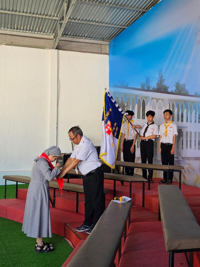 – Cha Tuyên Uý xứ đoàn trao khăn trợ úy cho Sr Marie Madalene Nguyễn Thị Kim Ái (SPC) để Sr phục vụ cho các em đoàn sinh trong xứ đoàn.