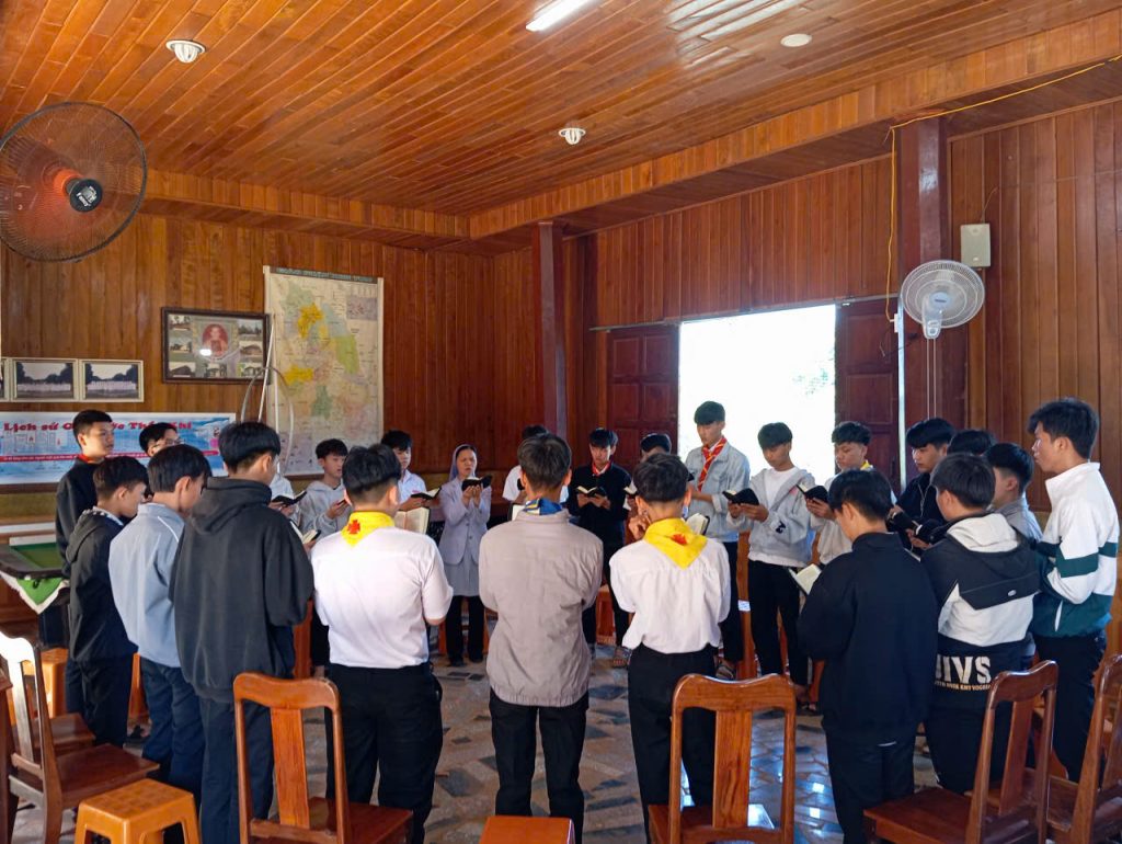 Ngay từ những giờ đầu buổi sáng, các em đã quy tụ đông đủ, mang theo sự háo hức nhưng cũng không kém phần trầm lắng của những người đang kiếm tìm tiếng Chúa trong cuộc đời. Mở đầu ngày sinh hoạt là giờ cầu nguyện, giúp các em lắng đọng tâm hồn, đặt mình trước sự hiện diện của Thiên Chúa và xin ơn soi sáng trên hành trình phân định.