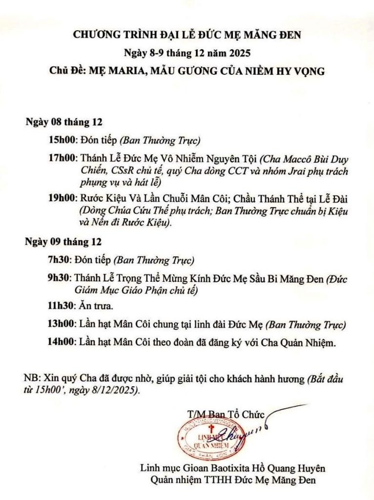 Thánh Lễ trọng thể mừng kính Đức Mẹ Sầu Bi Măng Đen sẽ được Đức Cha Aloisiô Nguyễn Hùng Vị, Giám mục Giáo phận Kon Tum chủ tế, vào lúc 9g30′ ngày 09/12/2025.