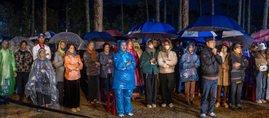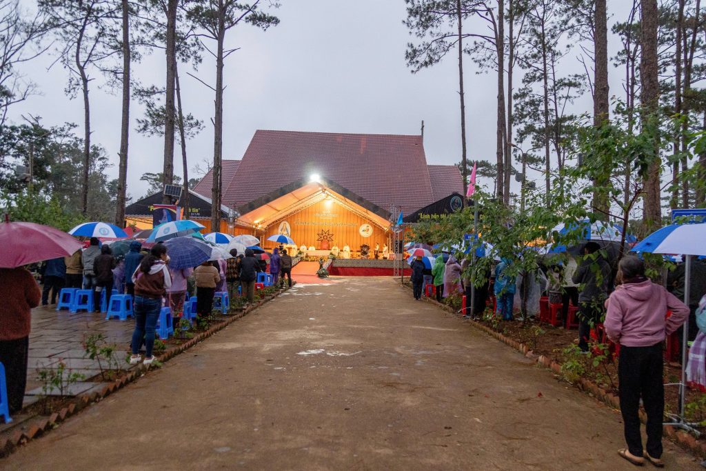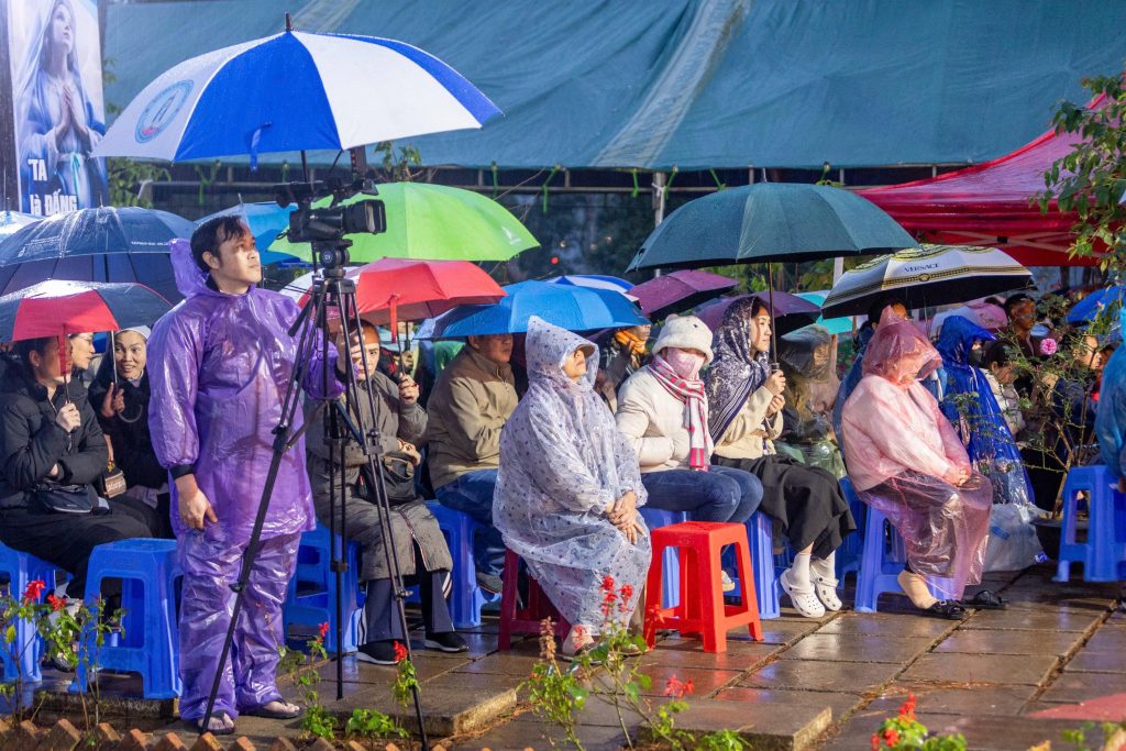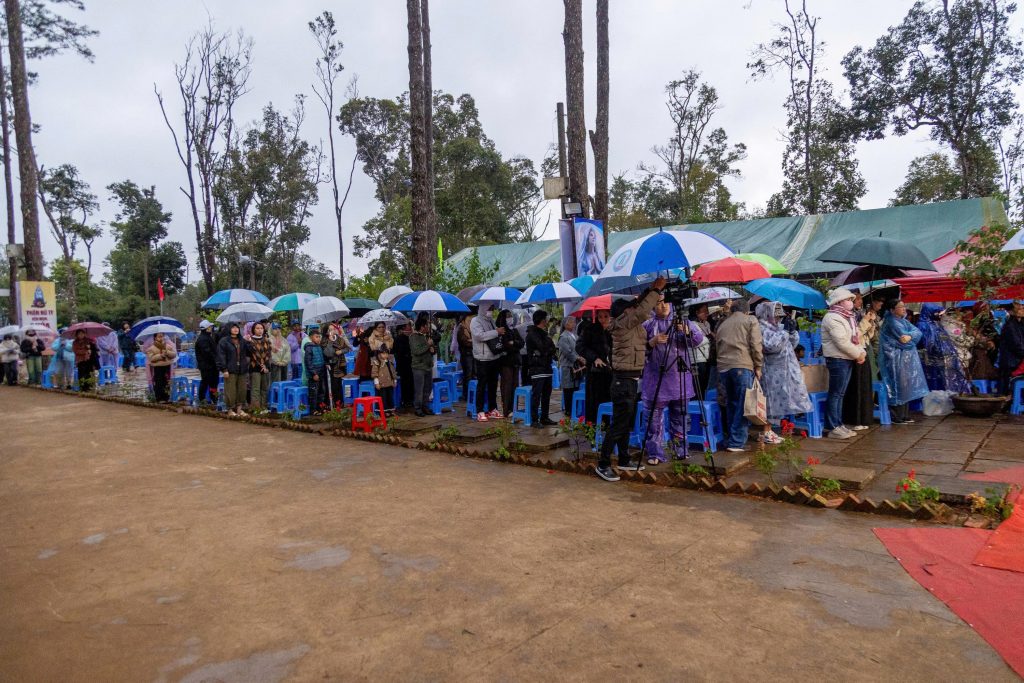 Chiều ngày 08/12/2025, mặc dù càng về chiều, sương xuống, lại thêm mưa phùn làm tiết trời lạnh hơn. Thế nhưng, những người con của Mẹ từ khắp nơi vẫn đổ dồn về Trung tâm mỗi lúc một đông. Càng về chiều, bước chân của những đoàn tín hữu và khách hành hương càng rộn rã, nắm tay nhau cùng tiến đến bên Mẹ.