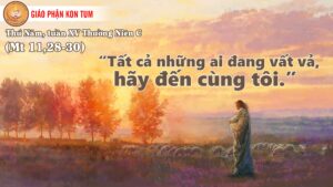 Khi ấy, Chúa Giêsu phán rằng: “Hãy đến với Ta tất cả, hỡi những ai khó nhọc và gánh nặng, Ta sẽ nâng đỡ bổ sức cho các ngươi. Hãy mang lấy ách của Ta và hãy học cùng Ta, vì Ta hiền lành và khiêm nhượng trong lòng, và tâm hồn các ngươi sẽ gặp được bình an. Vì ách của Ta thì êm ái và gánh của Ta thì nhẹ nhàng”.