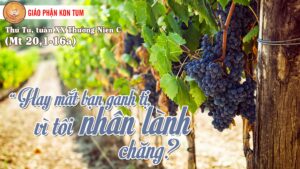 “Đến chiều chủ vườn nho bảo người quản lý rằng: ‘Hãy gọi những kẻ làm thuê mà trả tiền công cho họ, từ người đến sau hết tới người đến trước hết’. Vậy những người làm từ giờ thứ mười một đến, lãnh mỗi người một đồng. Tới phiên những người đến làm trước, họ tưởng sẽ lãnh được nhiều hơn; nhưng họ cũng chỉ lãnh mỗi người một đồng. Đang khi lãnh tiền, họ lẩm bẩm trách chủ nhà rằng: ‘Những người đến sau hết chỉ làm có một giờ, chúng tôi chịu nắng nôi khó nhọc suốt ngày mà ông kể họ bằng chúng tôi sao?’ Chủ nhà trả lời với một kẻ trong nhóm họ rằng: ‘Này bạn, tôi không làm thiệt hại bạn đâu, chớ thì bạn đã không thoả thuận với tôi một đồng sao? Bạn hãy lấy phần bạn mà đi về, tôi muốn trả cho người đến sau hết bằng bạn, nào tôi chẳng được phép làm như ý tôi muốn sao? Hay mắt bạn ganh tị, vì tôi nhân lành chăng?’