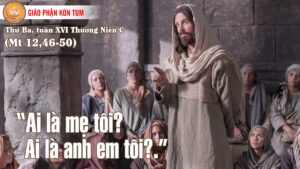 Khi ấy, Chúa Giêsu còn đang nói với dân chúng, thì mẹ Người và anh em Người đứng ngoài tìm cách nói chuyện với Người. Có kẻ thưa rằng: “Kìa, mẹ Ngài và anh em Ngài đang đứng tìm Ngài ngoài kia”. Nhưng Người trả lời kẻ ấy rằng: “Ai là mẹ Ta, ai là anh em Ta?” Rồi Người giơ tay chỉ các môn đệ mà nói: “Ðây là mẹ Ta và là anh em Ta, vì hễ ai làm theo ý Cha Ta trên trời, thì người ấy là anh em, chị em và là mẹ Ta vậy”.