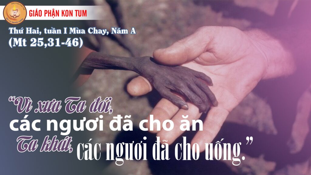 31 Khi ấy, Đức Giê-su nói với các môn đệ rằng : “Khi Con Người đến trong vinh quang của Người, có tất cả các thiên sứ theo hầu, bấy giờ Người sẽ ngự lên ngai vinh hiển của Người. 32 Các dân thiên hạ sẽ được tập hợp trước mặt Người, và Người sẽ tách biệt họ với nhau, như mục tử tách biệt chiên với dê. 33 Người sẽ cho chiên đứng bên phải Người, còn dê ở bên trái. 34 Bấy giờ Đức Vua sẽ phán cùng những người ở bên phải rằng : ‘Nào những kẻ Cha Ta chúc phúc, hãy đến thừa hưởng Vương Quốc dọn sẵn cho các ngươi ngay từ thuở tạo thiên lập địa. 35 Vì xưa Ta đói, các ngươi đã cho ăn ; Ta khát, các ngươi đã cho uống ; Ta là khách lạ, các ngươi đã tiếp rước ; 36 Ta trần truồng, các ngươi đã cho mặc ; Ta đau yếu, các ngươi đã thăm viếng ; Ta ngồi tù, các ngươi đến hỏi han.’ 37 Bấy giờ những người công chính sẽ thưa rằng : ‘Lạy Chúa, có bao giờ chúng con đã thấy Chúa đói mà cho ăn, khát mà cho uống ; 38 có bao giờ đã thấy Chúa là khách lạ mà tiếp rước ; hoặc trần truồng mà cho mặc ? 39 Có bao giờ chúng con đã thấy Chúa đau yếu hoặc ngồi tù, mà đến hỏi han đâu ?’ 40 Đức Vua sẽ đáp lại rằng : ‘Ta bảo thật các ngươi : mỗi lần các ngươi làm như thế cho một trong những anh em bé nhỏ nhất của Ta đây, là các ngươi đã làm cho chính Ta vậy.’ 41 Rồi Đức Vua sẽ phán cùng những người ở bên trái rằng : ‘Quân bị nguyền rủa kia, đi đi cho khuất mắt Ta mà vào lửa đời đời, nơi dành sẵn cho tên Ác Quỷ và các sứ thần của nó. 42 Vì xưa Ta đói, các ngươi đã không cho ăn ; Ta khát, các ngươi đã không cho uống ; 43 Ta là khách lạ, các ngươi đã không tiếp rước ; Ta trần truồng, các ngươi đã không cho mặc ; Ta đau yếu và ngồi tù, các ngươi đã chẳng thăm viếng.’ 44 Bấy giờ những người ấy cũng sẽ thưa rằng : ‘Lạy Chúa, có bao giờ chúng con đã thấy Chúa đói, khát, hoặc là khách lạ, hoặc trần truồng, đau yếu hay ngồi tù, mà không phục vụ Chúa đâu ?’ 45 Bấy giờ Người sẽ đáp lại họ rằng : ‘Ta bảo thật các ngươi : mỗi lần các ngươi không làm như thế cho một trong những người bé nhỏ nhất đây, là các ngươi đã không làm cho chính Ta vậy.’ 46 Thế là họ ra đi để chịu cực hình muôn kiếp, còn những người công chính ra đi để hưởng sự sống muôn đời.”
