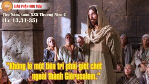 Khi ấy, tại Giê-ru-sa-lem, có mấy người Pha-ri-sêu đến thưa Đức Giê-su rằng : “Xin ông đi ra khỏi đây, vì vua Hê-rô-đê đang muốn giết ông !” Người bảo họ : “Các ông hãy đi nói với con cáo ấy thế này : ‘Hôm nay và ngày mai tôi trừ quỷ và chữa lành bệnh tật, ngày thứ ba tôi hoàn tất. Tuy nhiên, hôm nay, ngày mai và ngày mốt, tôi phải tiếp tục đi, vì một ngôn sứ mà chết ngoài thành Giê-ru-sa-lem thì không được.’