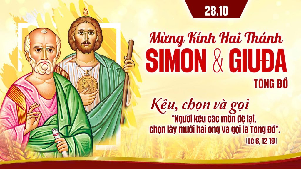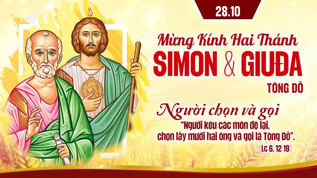Bài Tin Mừng hôm nay thuật lại việc Đức Giê-su tuyển chọn mười hai Tông Đồ, trong đó có hai vị thánh Tông đồ Giu-đa và Simon mà chúng ta mừng kính hôm nay. Thánh Giu-đa còn gọi là “Giu-đa Nhiệt Thành” hoặc “Ta-đê-ô” để tránh nhầm lẫn với Giu-đa Ít-ca-ri-ốt – kẻ bán Chúa. Trong bộ Tân Ước có thư của Thánh Giu-đa, tuy nhiên, các vị học giả Kinh Thánh cho rằng tác giả của Thư Giu-đa không phải là vị thánh chúng ta mừng kính hôm nay. Thánh Simon không được các tác giả sách Tân Ước ghi chép nhiều, chỉ nêu tên ngài trong Nhóm Mười Hai mà thôi và cũng không phải là Simon Phê-rô, nhưng là cháu của Thánh Giuse – Cha Nuôi Đức Giê-su, nghĩa là bà con họ hàng với Đức Giê-su và thánh Giu-đa cũng vậy. Chúng ta chỉ biết Thánh Simon là con ông An-phê để dễ phân biệt với các “Simon” khác. Do đó, Giáo Hội mừng kính chung hai vị thánh này vào cùng một ngày.