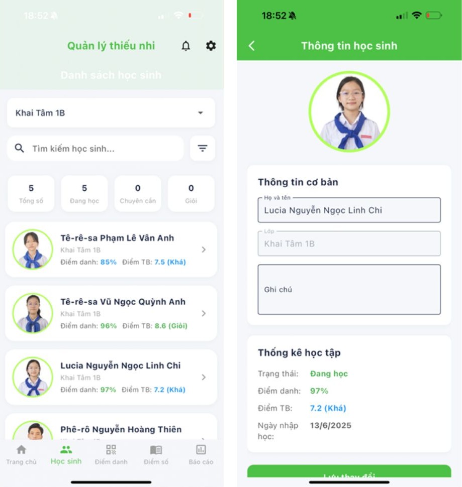 – Theo dõi và cập nhật danh sách thiếu nhi theo từng lớp, từng cấp học;