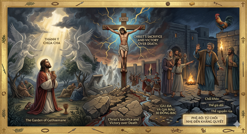Trong bốn sách Tin Mừng, trình thuật Khổ nạn của thánh Mát-thêu hiện lên như một bức tranh hùng tráng nhưng cũng đầy bi kịch. Là một người am tường Luật pháp và các Ngôn sứ, Mát-thêu không chỉ kể lại một vụ án oan sai, mà ông đang chứng minh một chân lý đức tin: Đức Giê-su Ki-tô là Đấng Thiên Sai (Messiah) vâng phục trọn vẹn ý muốn của Chúa Cha để làm trọn vẹn Kinh Thánh. Trong bức tranh ấy, sự đối lập giữa một bên là Thiên Chúa làm người đầy uy quyền nhưng tự hạ, và một bên là con người (tiêu biểu là Phê-rô) đầy nhiệt huyết nhưng yếu đuối, đã tạo nên những bài học thần học sâu sắc.