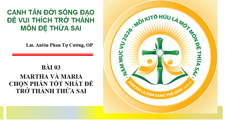 Anh chị em thân mến, năm 2026 này, Chúa mời gọi chúng ta chọn “phần tốt nhất” để trở thành môn đệ thừa sai vui thích. Đừng để cuộc sống bận rộn cướp mất thời gian bên Chúa. Khi lòng ta đầy Chúa, chúng ta sẽ mang Chúa đến cho tha nhân một cách tự nhiên, nhẹ nhàng.