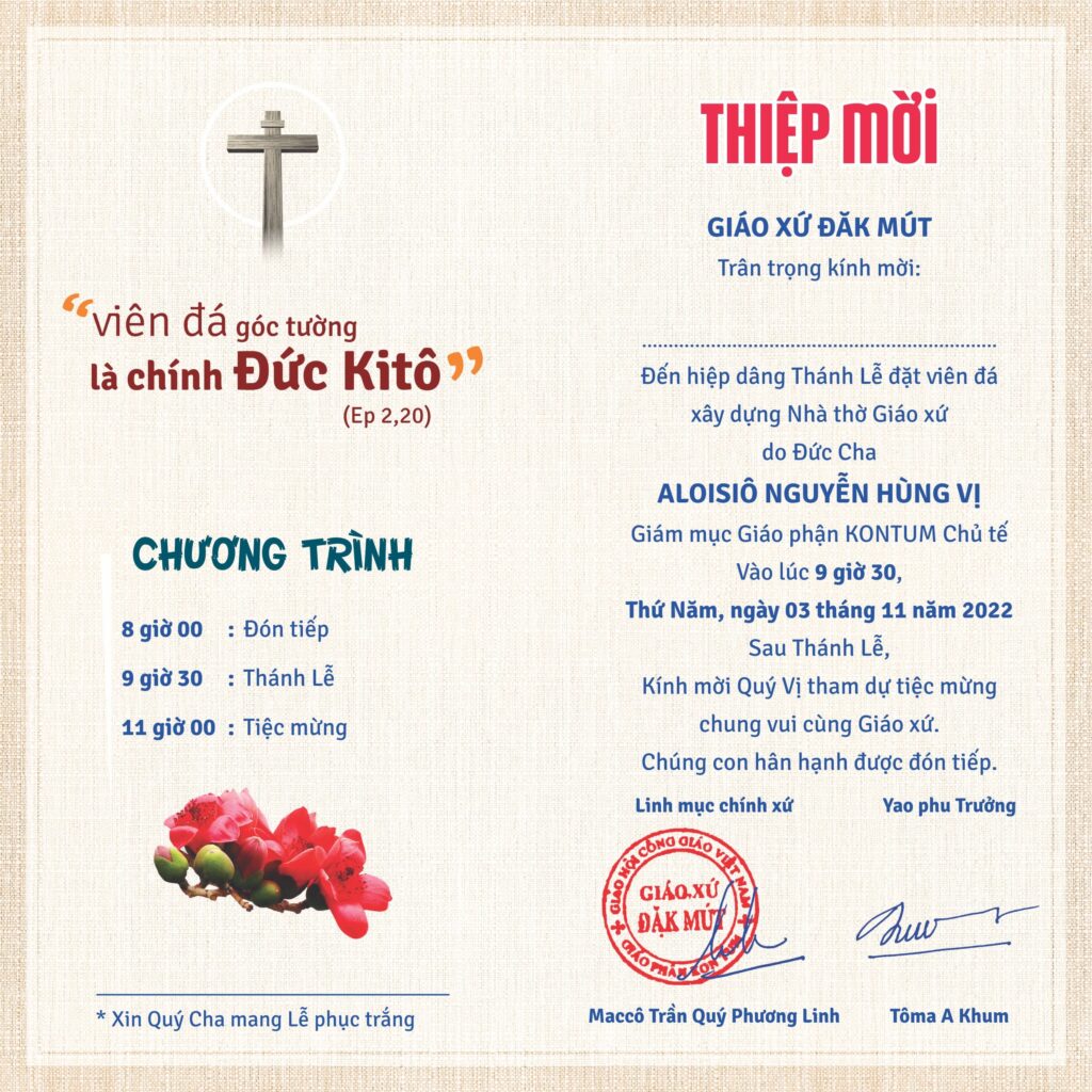 Thiệp Mời Thánh Lễ Đặt Viên Đá Xây Dựng Nhà Thờ Giáo Xứ Đăk Mút 26-10-202226-10-2022 Vào lúc 9 giờ 30, Thứ Năm ngày 03 tháng 11 năm 2022. WGPKT(26/10/2022) KONTUM