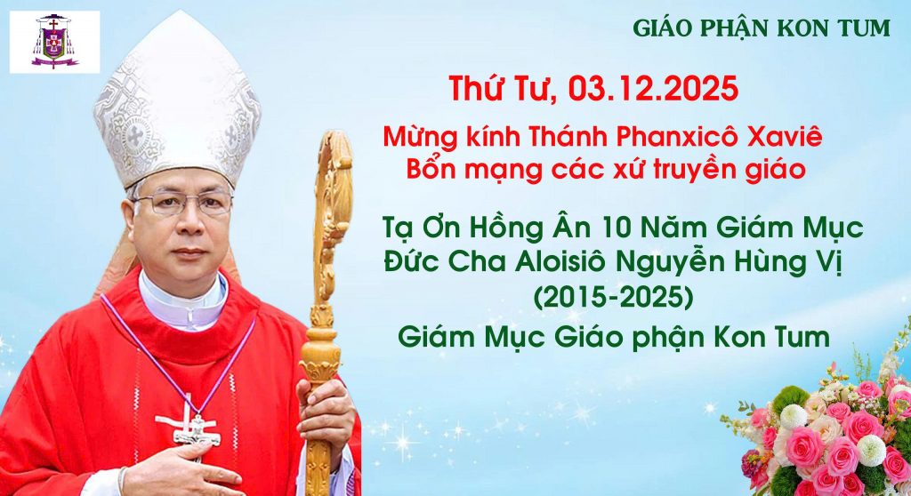 Ngày 3 tháng 12 năm 2025 sắp tới đây là lễ mừng kính Thánh Phanxicô Xaviê, Bổn mạng các xứ truyền giáo; bổn mạng Chủng Viện Thừa Sai Kon Tum và Gia Đình Phanxicô Xaviê. Đây cũng là dịp đặc biệt kỷ niệm 10 năm Giám Mục của Đức Cha Aloisiô, Giám Mục Giáo Phận.