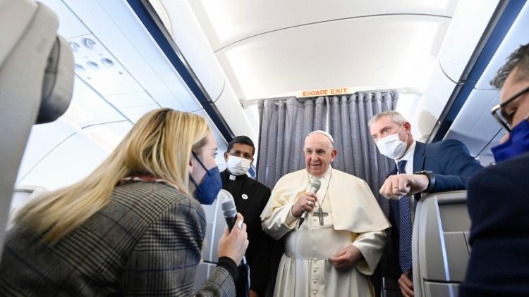 Ngày 6/12/2021, trên chuyến bay từ thủ đô Athens của Hy Lạp về Roma, Đức Thánh Cha đã trả lời một số câu hỏi của các nhà báo về các vấn đề như chuyến tông du, di dân, tình huynh đệ với Chính Thống, vv. Nói về tài liệu của châu Âu liên quan đến từ ngữ “lễ Giáng sinh”, Đức Thánh Cha nói đây là một sự lỗi thời; còn về việc từ chức của Đức tổng giám mục Aupetit của Paris, Đức Thánh Cha nói Đức tổng giám mục là nạn nhân của chuyện phiếm của thế gian.