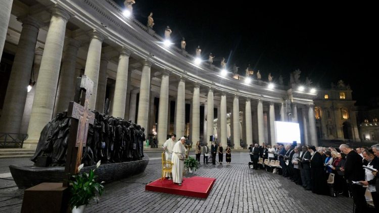 Chiều thứ Năm ngày 19/10, Đức Thánh Cha đã tham dự buổi cầu nguyện cho những người di cư và tị nạn do Bộ Phục vụ Phát triển Con người Toàn diện tổ chức. Buổi cầu nguyện diễn ra cạnh tượng đài người di cư “Angels Unawares – Các thiên thần không được biết đến” được đặt tại quảng trường thánh Phêrô.