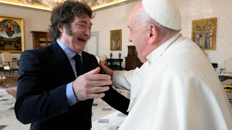 Một số câu nói đùa và tiếng cười, rồi Đức Thánh Cha nói: “Thật hân hạnh”. Tổng thống trả lời : “Hôm nay hơn bao giờ hết”. Đây là cuộc gặp chính thức đầu tiên giữa Đức Phanxicô và tổng thống, một nhà kinh tế theo chủ nghĩa tự do và lãnh đạo liên minh La libertad avanza (tự do tiến bộ), người vừa trở về sau chuyến đi Tel Aviv trong những ngày gần đây. Đến nơi trước 9 giờ sáng, nhà lãnh đạo Argentina, trước khi vào Vatican qua Quảng trường Thánh Phêrô và vòm chuông, để đến sân Saint-Damase rồi đến Dinh Tông tòa, đã dừng đoàn xe của mình trên đại lộ Hòa giải để ra ngoài. ra xe và chụp ảnh cùng khách hành hương Argentina. Đi cùng với một phái đoàn gồm sáu người (trong đó có Rabbi Axel Wahnish, người được bổ nhiệm làm đại sứ mới của Argentina tại Israel), Javier Milei đã đến Rôma từ thứ Bảy và đến thăm một số địa điểm mang tính biểu tượng của thành phố. Chiều nay, ông sẽ gặp Tổng thống Nước Cộng hòa, Sergio Mattarella, và Chủ tịch Hội đồng, Giorgia Meloni.