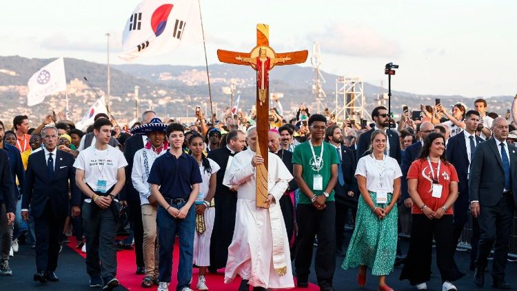Các bạn trẻ rất thân mến, trước những đau khổ và hy vọng của thế giới, chúng ta hãy hướng ánh mắt về Đức Giêsu. Khi sắp trút hơi thở trên thập giá, Người đã trao phó Đức Trinh Nữ Maria cho Thánh Gioan như mẹ ông, và trao Thánh Gioan cho Mẹ như con của Mẹ. Món quà tột đỉnh của tình yêu ấy cũng được ban cho mỗi người môn đệ, cho tất cả chúng ta. Vì thế, cha mời gọi các con đón nhận mối tương quan thánh thiêng này với Đức Maria – người Mẹ đầy yêu thương và thấu hiểu – và nuôi dưỡng tương quan ấy cách đặc biệt qua kinh Mân Côi. Như thế, trong mọi hoàn cảnh của cuộc đời, chúng ta sẽ cảm nghiệm rằng mình không bao giờ cô đơn, nhưng luôn là những người con được Thiên Chúa yêu thương, tha thứ và khích lệ. Và các con hãy vui mừng làm chứng về điều này!