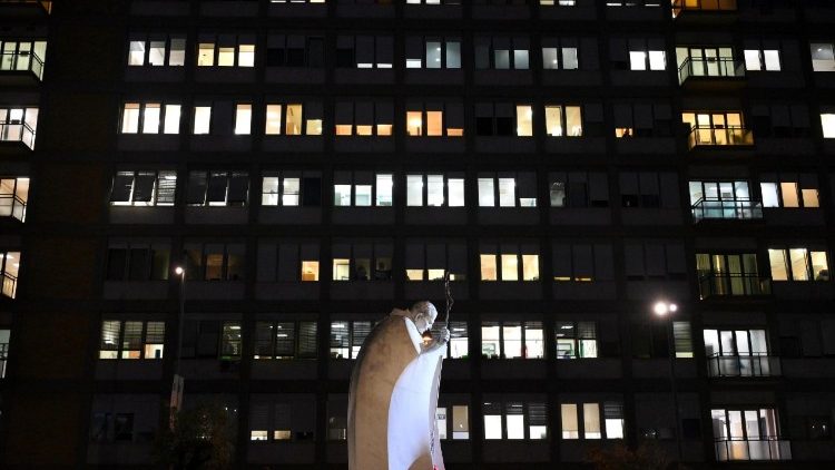 Đức Thánh Cha đã nhập viện Gemelli được 12 ngày kể từ ngày 14/2 vì nhiễm trùng đường hô hấp, sau đó đến ngày 17/2, những xét nghiệm cho thấy một bệnh cảnh lâm sàng phức tạp vì nhiễm trùng đa vi khuẩn. Trong cuộc họp báo chiều ngày 21/2, các bác sĩ đã cho biết Đức Thánh Cha không còn trong “tình trạng nguy kịch”, nhưng vẫn chưa ra khỏi tình trạng nguy hiểm. Đến nay, dù chưa hết nguy hiểm nhưng tình trạng ổn định và có một chút cải thiện.