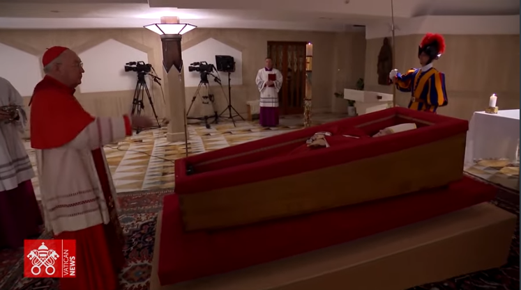 Vào lúc 9 giờ sáng thứ Tư, ngày 23/4/2025, quan tài với thi hài của Đức Giáo hoàng Phanxicô sẽ được đưa từ Nhà nguyện Domus Sanctæ Marthæ (Nhà Thánh Marta) đến Đền thờ Thánh Phêrô, theo quy định trong Nghi lễ an táng các Giáo hoàng (các số 41-65)”.