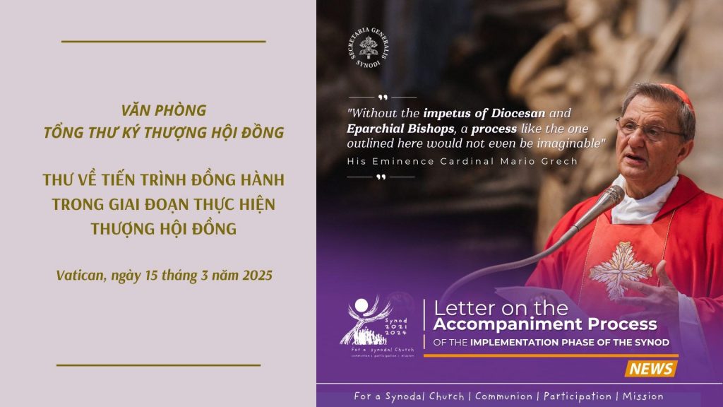 WHĐ (16/3/2025) – Văn phòng Tổng Thư ký Thượng Hội đồng Giám mục đã gửi đến tất cả các Giám mục thuộc Giáo hội Công giáo Rôma cũng như Giáo hội Công giáo Đông phương, và qua các ngài, đến toàn thể “Dân thánh của Thiên Chúa” được ủy thác cho các ngài chăm sóc, một Lá thư về tiến trình đồng hành trong giai đoạn thực hiện Thượng Hội đồng “Hướng tới một Giáo hội hiệp hành: hiệp thông, tham gia, sứ vụ”.