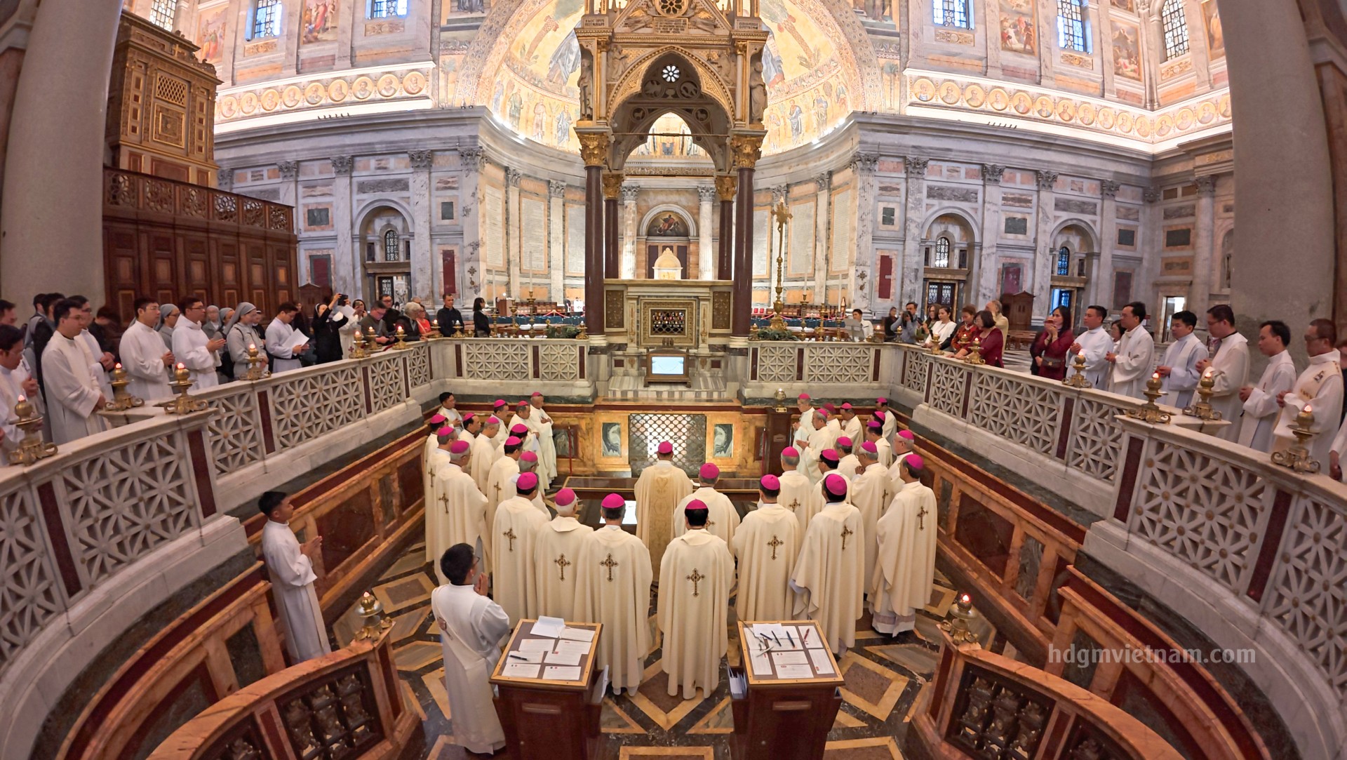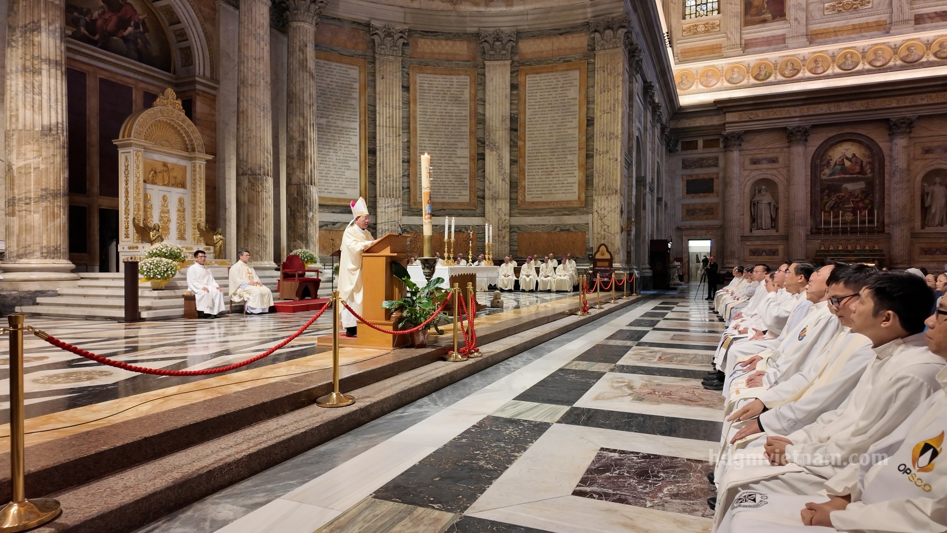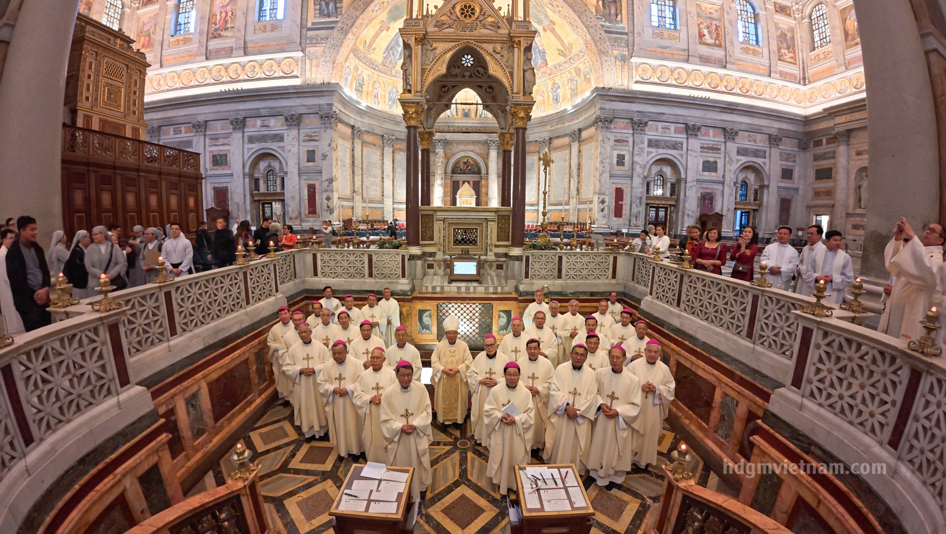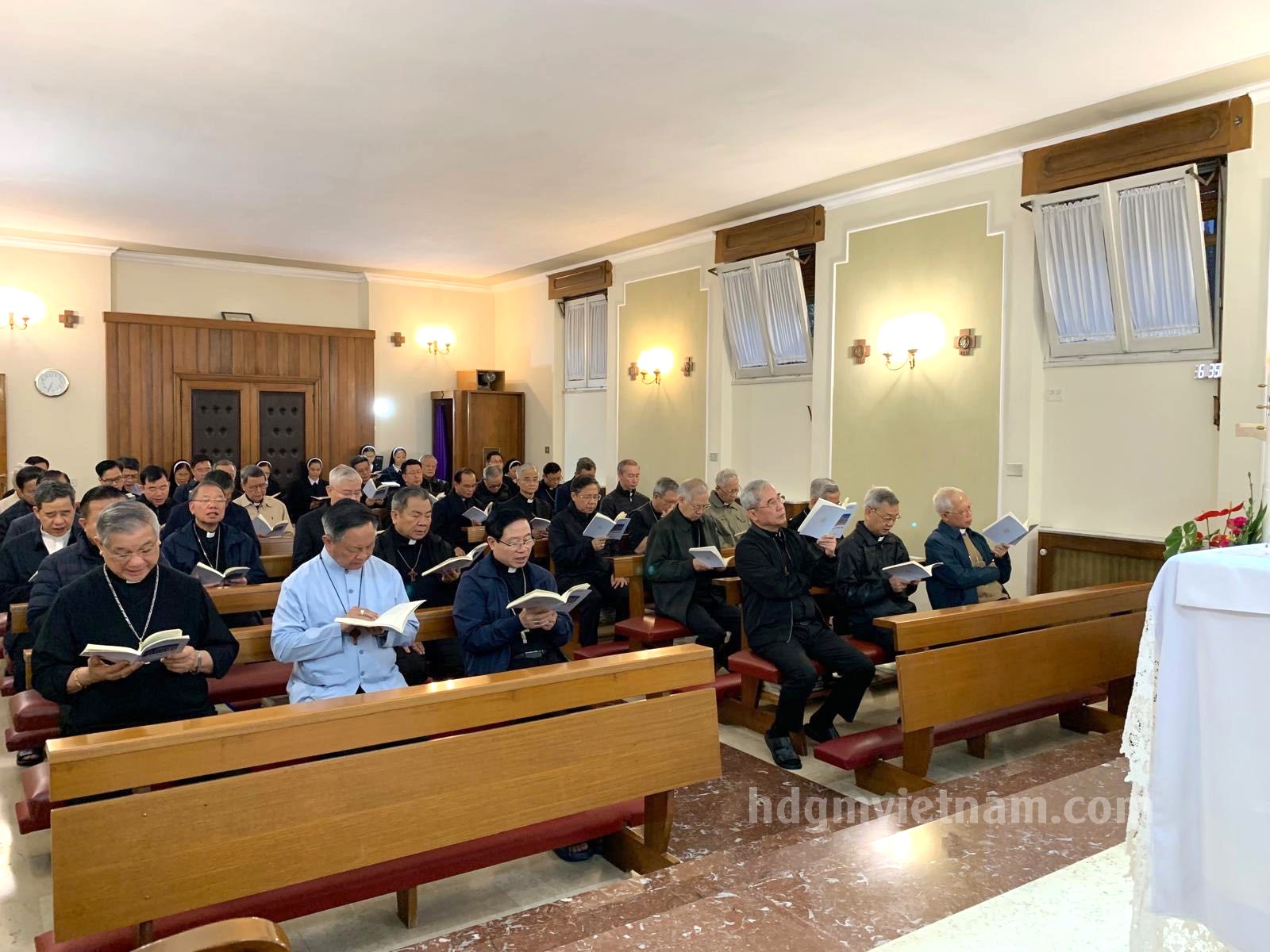 Buổi chiều, các Đức Giám mục đến dâng Thánh lễ tại Đền thờ Thánh Phaolô Ngoại Thành, cùng với đông đảo linh mục, tu sĩ Việt Nam đang theo học hoặc đang phục vụ tại Rôma. Đức Tổng Giám mục Giuse Vũ Văn Thiên, Phó Chủ tịch HĐGMVN, mời gọi cộng đoàn cảm nhận hồng ân đặc biệt khi được cùng hiện diện và dâng lễ ngay tại trái tim của Giáo hội hoàn vũ, nơi cội nguồn của đức tin tông truyền.