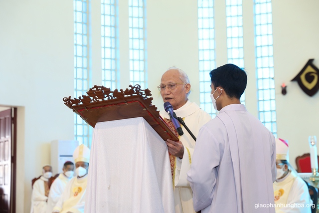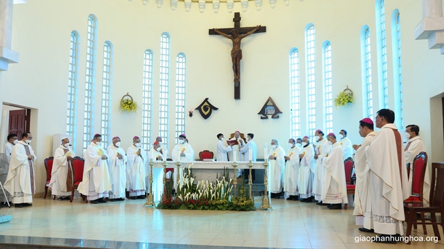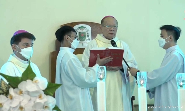 Thánh lễ do Đức cha Antôn Vũ Huy Chương – Nguyên Giám mục Giáo phận Đà Lạt chủ tế và ngài cũng là chủ phong trong Nghi lễ truyền chức Giám mục hôm nay. Hai Giám mục phụ phong là Đức cha Gioan Maria Vũ Tất – Nguyên Giám mục Giáo phận Hưng Hoá và Đức cha Phêrô Nguyễn Văn Viên – Giám quản Tông tòa Giáo phận Hưng Hóa.