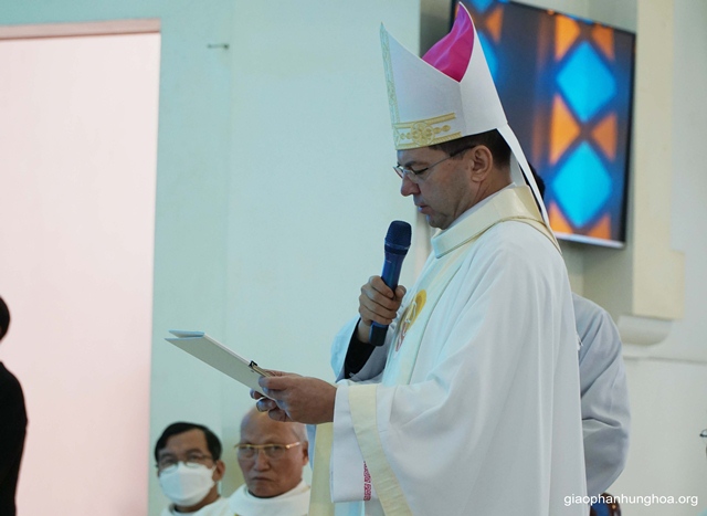 Tiếp nối tâm tình của Đức Tổng Giám mục Giuse, Đức Tổng Giám mục Marek Zalewski – Đại diện Đức Thánh Cha tại Việt Nam, cầu chúc cho quý Đức Tổng, Đức Hồng Y, quý Đức cha, quý cha, quý tu sĩ cùng toàn thể cộng đoàn luôn tràn đầy tình yêu, ân sủng của Đức Giêsu Kitô và ơn thông hiệp của Chúa Thánh Thần. Bên cạnh đó, Đức Tổng Giám mục Marek Zalewski cũng gửi lời cảm ơn tới các Đức Giám mục tiền nhiệm đã dày công vun đắp, xây dựng giáo phận này, cũng như mọi thành phần dân Chúa đã chuẩn bị ngày đại lễ hôm nay để chào đón tân mục tử của Giáo phận Hưng Hóa. Cách riêng, ngài cầu chúc cho Đức Tân Giám mục Đaminh bắt đầu sứ vụ mục tử theo gương thầy Giêsu, đến để yêu thương, dẫn dắt dân của Ngài như đoạn Kinh Thánh đã nói: “Thần khí Chúa đã ngự xuống trên tôi, Ngài xức dầu, sai tôi đi loan báo Tin Mừng cho người nghèo khó, phục hồi thị lực cho những ai bị mù lòa, giải thoát cho những ai đang bị cầm tù”. Đồng thời, ngài cũng cầu chúc và mời gọi quý thân nhân, ân nhân của Đức cha Đaminh cùng mọi thành phần dân Chúa trong Giáo phận Hưng Hóa hãy luôn tin tưởng và yêu mến Đức Giám mục của mình. Vì khi yêu mến Đức Giám mục là yêu mến Hội Thánh, và yêu mến Hội Thánh là yêu mến Đức Giêsu Kitô – mục tử của Hội Thánh.