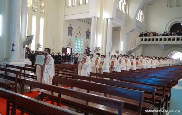 Đúng 08g45, đoàn đồng tế tiến vào nhà thờ với niềm hân hoan trong tiếng kèn và những hồi trống vang dội tưng bừng.