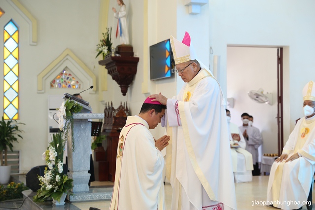 Nghi thức truyền chức Giám mục được diễn nghĩa bằng việc Đức Giám mục chủ phong xức dầu thánh trên đầu vị Tân Giám mục, trao sách Phúc Âm, trao nhẫn Giám mục, đội mũ mitra, trao gậy mục tử, và cuối cùng là trao ngai tòa Giám mục Hưng Hóa cho Đức Tân Giám mục.
