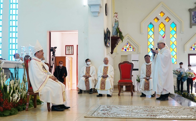 Trước khi kết thúc Thánh lễ, Đức Tổng Giám mục Giuse Nguyễn Chí Linh – Chủ tịch Hội đồng Giám mục Việt Nam có lời chúc mừng các đấng chủ chăn tiền nhiệm vì “cơ đồ giáo phận” đã có người gánh vác. Đồng thời, Đức TGM Giuse chia sẻ một cách đầy thú vị và hài hước rằng: Đức cha Đaminh là Giám mục trẻ nhất nhưng lại quản lý địa bàn rộng lớn với miền “thập tỉnh Tây Bắc”. Hưng Hóa không chỉ rộng lớn về lãnh thổ mà còn phong phú về văn hóa, đầy dấu tích lịch sử và có nhiều địa danh nổi tiếng, cũng là một vùng miền đa sắc tộc, đa ngôn ngữ. Chính vì vậy mà Chúa đã chuẩn bị cho Giáo phận Hưng Hóa một vị mục tử rất từng trải, cũng kiêm nhiệm đủ mọi chức vụ, để đồng hành với giáo phận đa sắc tộc, đa ngôn ngữ này. Đức Tổng Giuse cầu chúc cho Giáo phận Hưng Hóa bắt đầu một kỷ nguyên “hiệp nhất và yêu thương” xây dựng và mở mang nước Chúa.