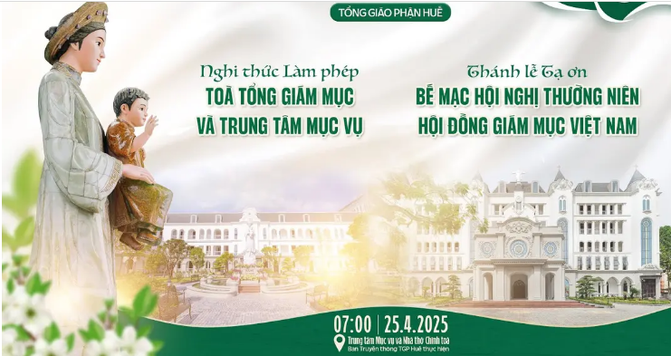 WHĐ (25/4/2025) – Nghi thức làm phép Tòa Tổng Giám mục và Trung tâm Mục vụ của Tổng Giáo phận Huế sẽ diễn ra lúc 7:00 thứ Năm ngày 25/4/2025 và sau đó thánh lễ bế mạc Hội nghị Thường niên lần I/2025 của Hội đồng Giám mục Việt Nam sẽ diễn ra lúc 08:00 tại Nhà thờ Chính tòa Phủ Cam.