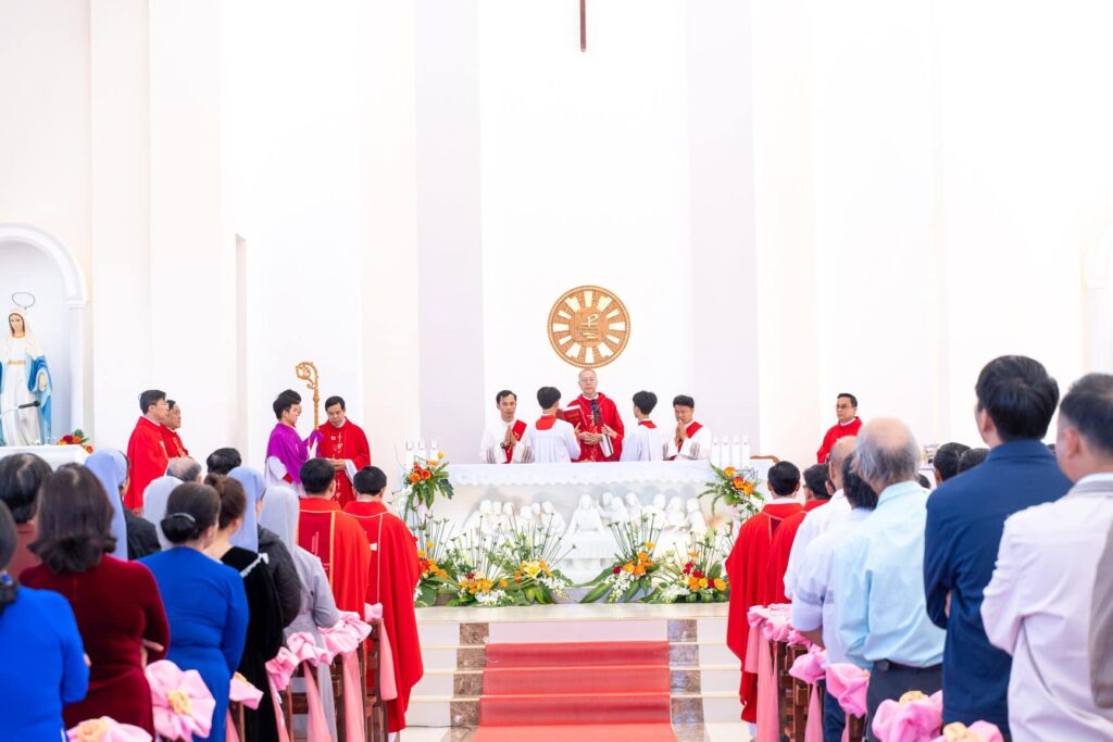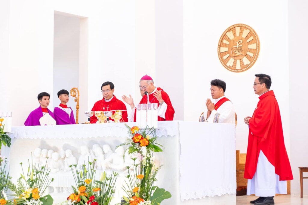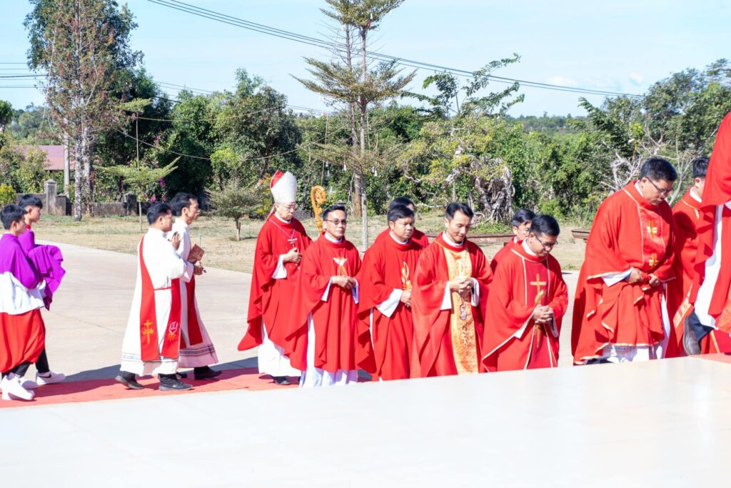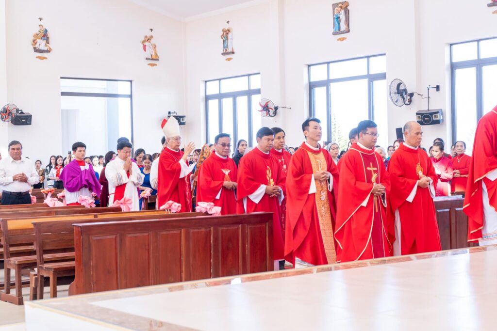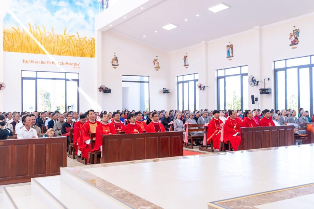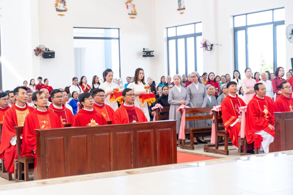 Đồng tế với Đức Cha trong thánh lễ có cha Đại diện Giám mục về Tu sĩ, cha Giám đốc Chủng viện Thừa sai Kon Tum, cha Quản lý giáo phận, cha chính xứ Vinh Sơn và một số quý cha. Hiệp dâng thánh lễ có Thầy phó tế, quý tu sĩ, đại diện quý giáo xứ bạn, quý khách và cộng đoàn dân Chúa giáo xứ Vinh Sơn.