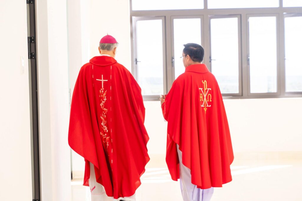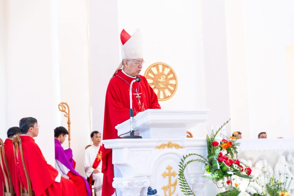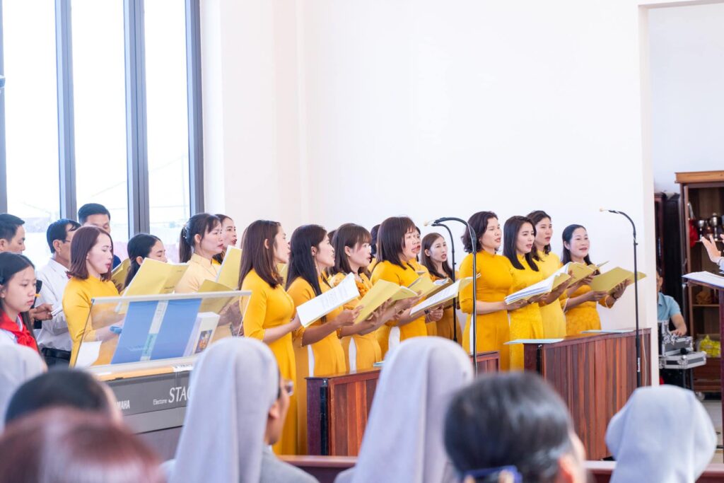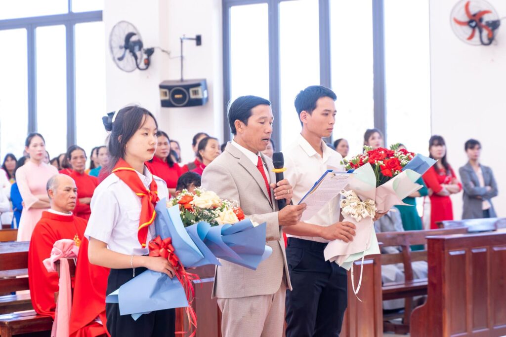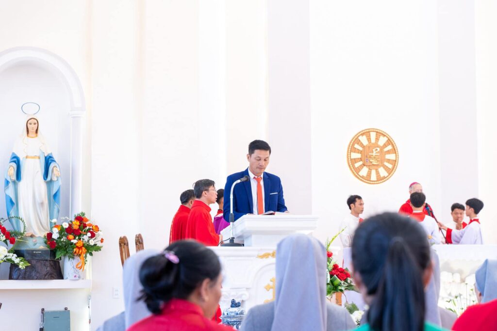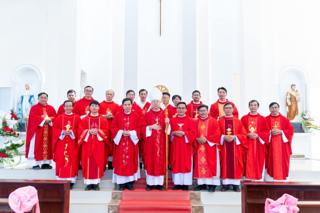 Đồng tế với Đức Cha trong thánh lễ có cha Đại diện Giám mục về Tu sĩ, cha Giám đốc Chủng viện Thừa sai Kon Tum, cha Quản lý giáo phận, cha chính xứ Vinh Sơn và một số quý cha. Hiệp dâng thánh lễ có Thầy phó tế, quý tu sĩ, đại diện quý giáo xứ bạn, quý khách và cộng đoàn dân Chúa giáo xứ Vinh Sơn.