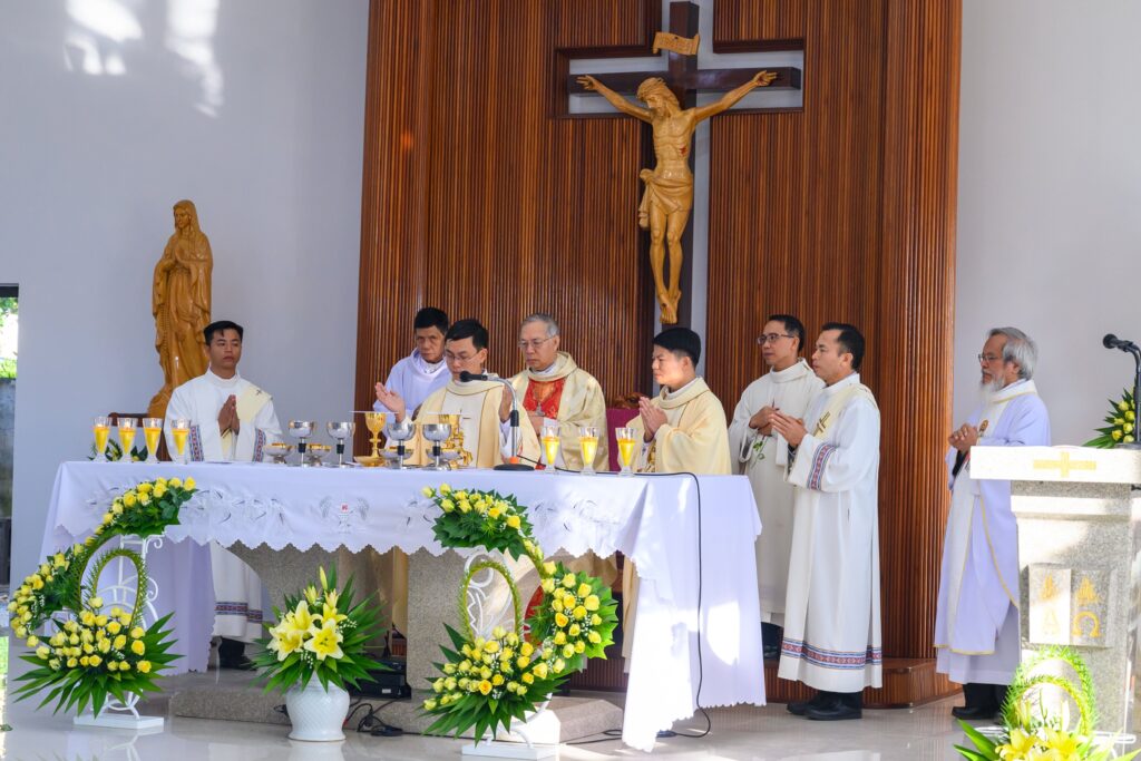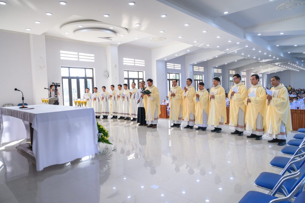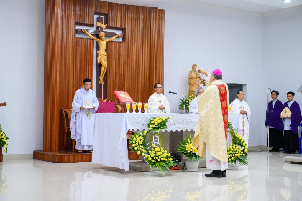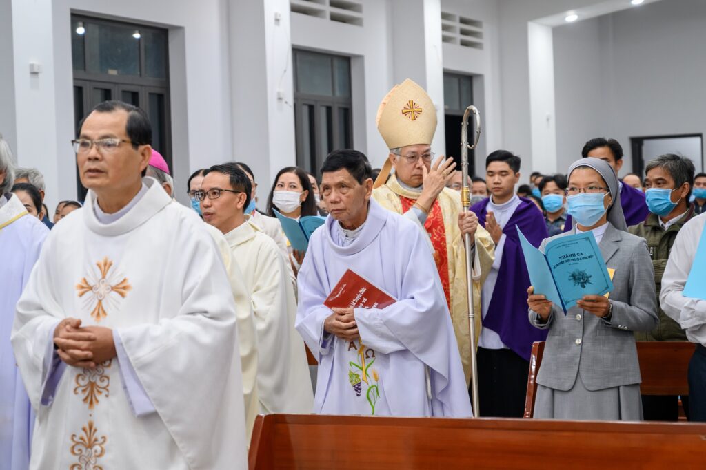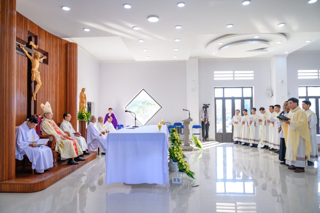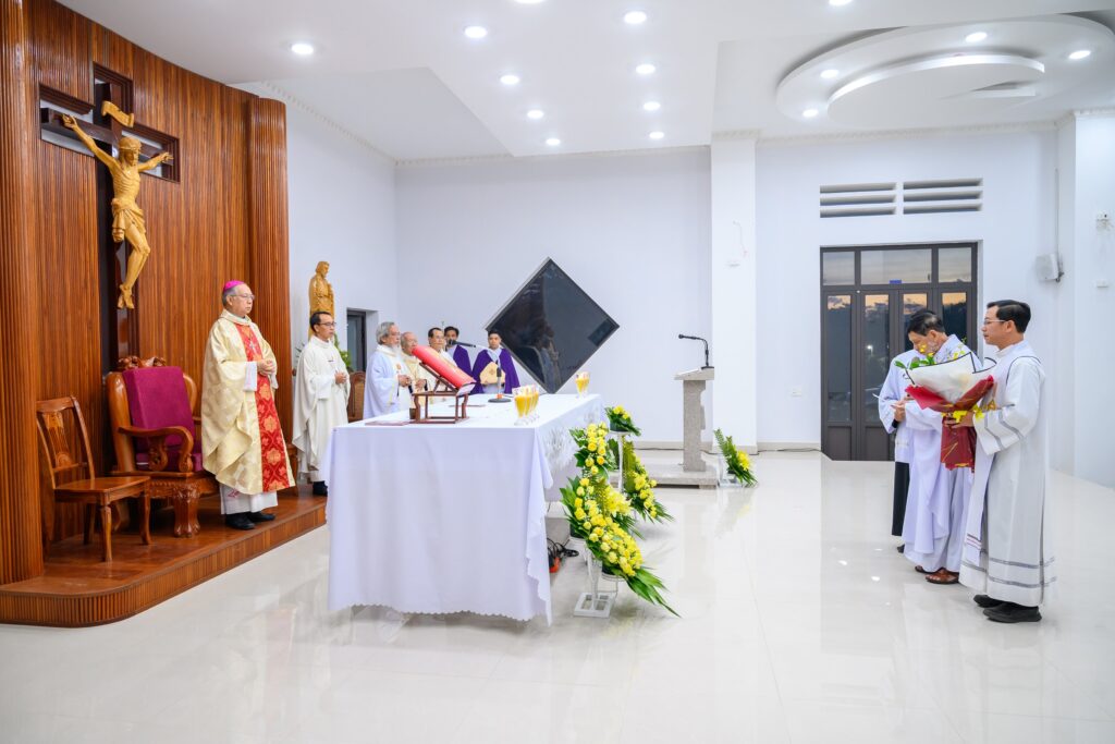 Thánh lễ diễn ra tại Nhà Nguyện của Trung Tâm Mục Vụ, trong khuôn viên Tòa Giám Mục. Hiệp thông trong Thánh lễ có sự hiện diện của Đức Cha Phêrô, nguyên Giám mục Giáo phận, Cha Tổng Đại diện, quý Cha, quý Thầy tiến chức, quý Tu sĩ và đại diện gia đình của các tiến chức.
