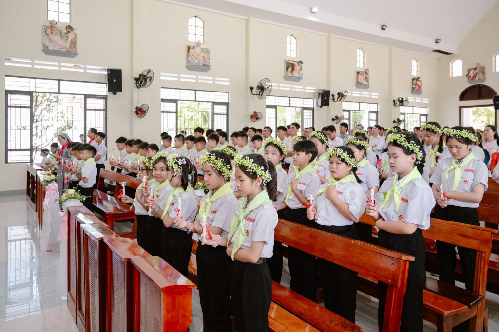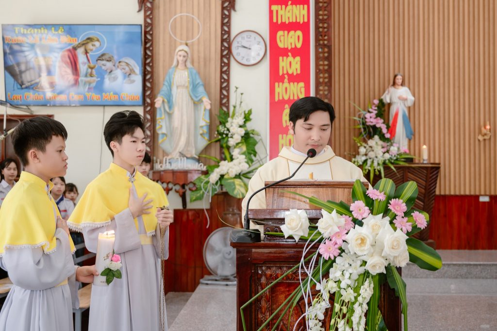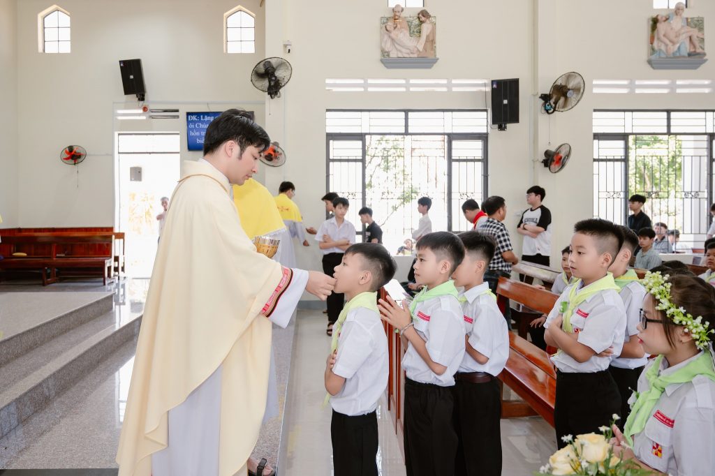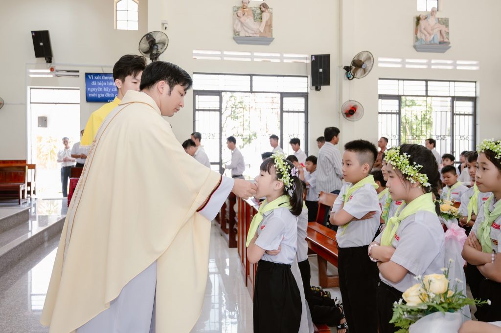 Giây phút hồi hộp mong đợi nhất cũng đã đến. Các em nghiêm trang đến trước bàn thờ và đón rước Mình Máu Thánh Chúa. Trong khoảnh khắc ấy, Chúa Giêsu đã ngự vào tâm hồn từng em, kết nối một mối dây yêu thương bền chặt. Từ đây, Thánh Thể sẽ là lương thực nuôi dưỡng, là ánh sáng dẫn đường để các em lớn lên trong đức tin và sống một đời sống mới đầy ý nghĩa.