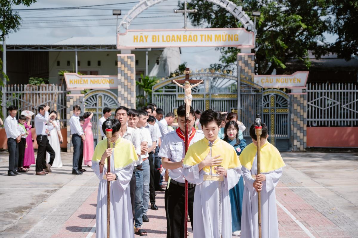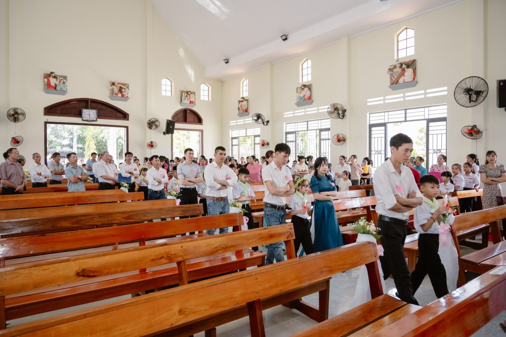 Tiếng kèn của Hội Kèn Giáo xứ vang lên, ngân dài, hòa vào tiếng bước chân của đoàn rước. Các em, tay nâng ngọn nến sáng, cùng cha mẹ tiến vào thánh đường – nơi từng viên gạch, từng hàng ghế dường như cũng lắng lại để chờ đón giờ phút thiêng liêng này. Trong ánh mắt các em là sự háo hức xen lẫn hồi hộp, còn trên gương mặt cha mẹ là niềm tự hào và xúc động.
