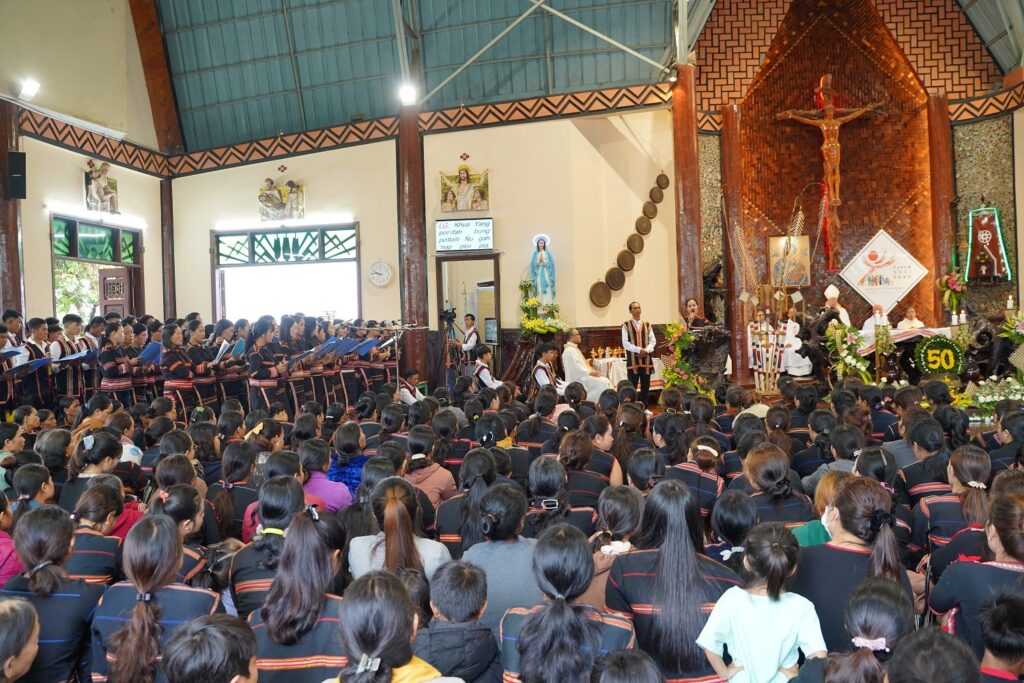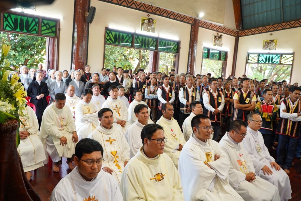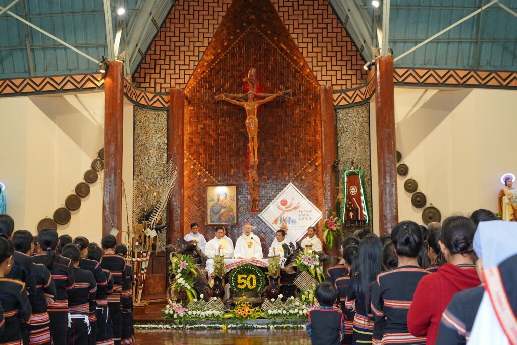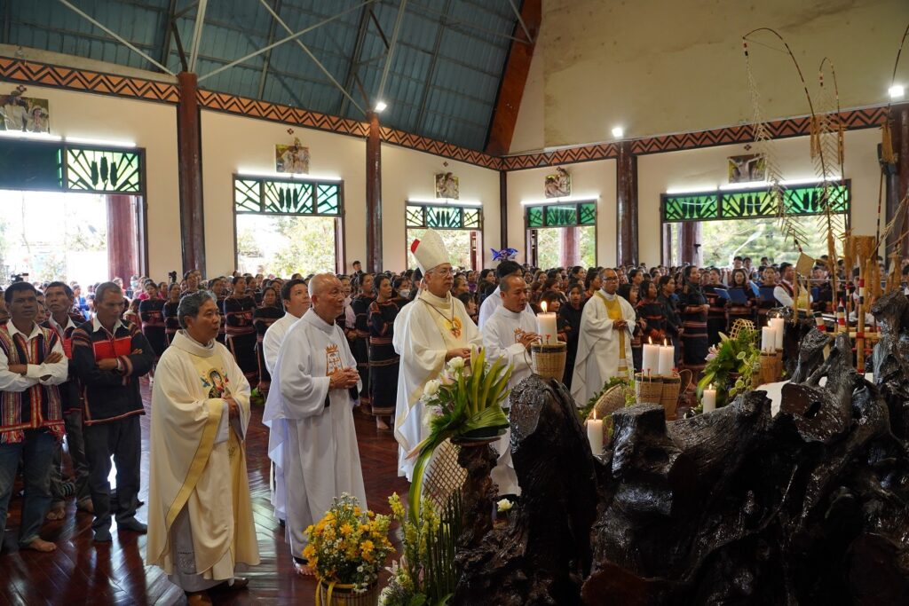 Chủ tế Thánh Lễ tạ ơn mừng 50 năm thành lập giáo xứ Plei Chuêt là Đức Cha Aloisio Nguyễn Hùng Vị – Giám Mục Giáo Phận Kontum. Cùng hiệp thông với Đức Cha có quý Cha, quý tu sĩ nam nữ và cộng đoàn.
