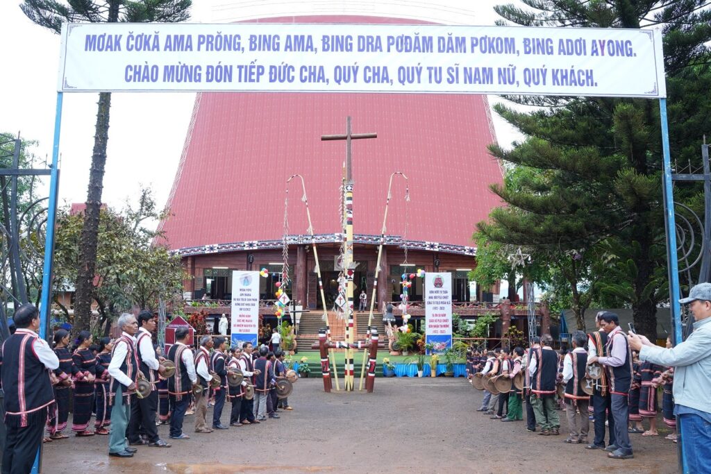 Đức Cha đáp lời cũng với ý nguyện chúc mừng và tạ ơn Chúa trong ngày hôm nay. Đức Cha không quên chúc mừng và cảm ơn sự hiện diện và cộng tác của quý Cha quý Thầy Dòng Chúa Cứu Thế đã hoạt động trong Giáo Phận Kontum. Đức Cha cũng chúc mừng và cảm ơn Cha Sĩ Tín cùng với các công trình dịch Kinh Thánh, dịch Sách Lễ …