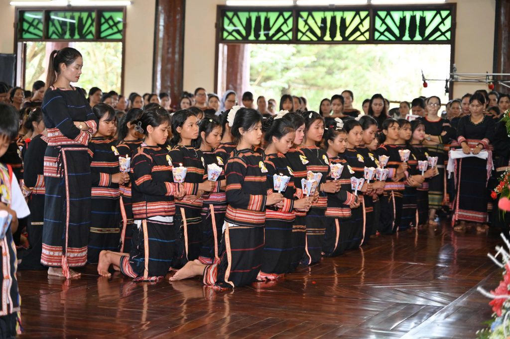 Trong trang phục truyền thống, các em thiếu nhi rạng rỡ tiến vào nhà thờ, tạo nên một bầu khí vừa vui tươi, hân hoan, vừa trang nghiêm và thánh thiêng.