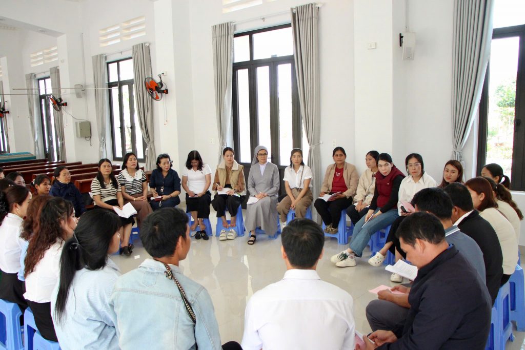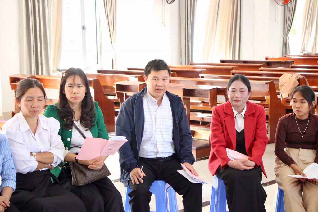 Sau đó, quý thầy cô được chia thành ba nhóm thảo luận: (1) Nhóm Nội trú; (2) Nhóm Mầm non và Tiểu học; (3) Nhóm Trung học cơ sở, THPT, Cao đẳng và Đại học. Các câu hỏi thảo luận chủ yếu được rút tỉa từ Giáo huấn của Giáo hội và thực trạng giáo dục tại địa phương trong Giáo phận. Đến 15h00, các nhóm đã tiến hành đúc kết nội dung. Qua những trình bày của các tham dự viên, biết bao bao trăn trở, khó khăn và mong đợi đã được lắng nghe và chia sẻ trong tinh thần hiệp hành.