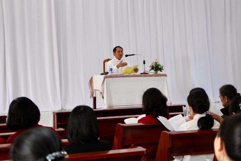 Lúc 10h00, Đức Cha Aloisiô đã ban huấn từ và chủ tế Thánh lễ cầu nguyện cho quý Thầy Cô. Những tâm tình và trăn trở của Vị Cha chung về nhu cầu của Giáo phận nhà trong chiều kích giáo dục đã khơi dậy trong tâm hồn các linh mục, tu sĩ và quý thầy cô nhiều thao thức để phụng sự Thiên Chúa và phục vụ anh chị em trên cánh đồng truyền giáo Tây Nguyên. Đức Cha cũng mong mỏi các tham dự viên luôn ý thức công việc giảng dạy không chỉ là một nghề để truyền đạt kiến thức nhưng còn là sứ vụ gieo mầm nhân bản và đức tin cho các thế hệ trẻ.