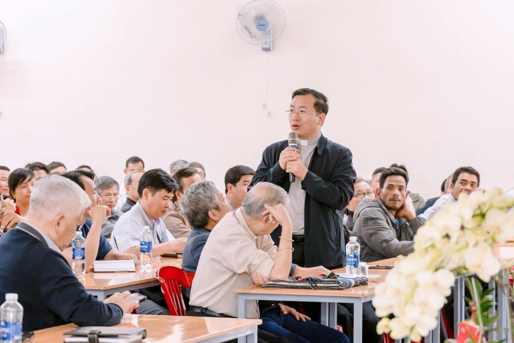 Phần thảo luận xen kẽ diễn ra sôi nổi với nhiều thắc mắc từ quý Cha và các tham dự viên về những khó khăn thực tế khi triển khai mô hình này tại các giáo xứ vùng sâu, vùng xa. Giải đáp các băn khoăn, Đức Cha Aloisiô khích lệ: “Đây là lĩnh vực còn mới mẻ tại Giáo phận chúng ta, nên không tránh khỏi những bỡ ngỡ ban đầu. Vạn sự khởi đầu nan, nhưng chúng ta cần kiên trì từng bước để hoàn thiện cơ chế, giúp việc quản trị tài sản của Chúa được tốt đẹp hơn.”