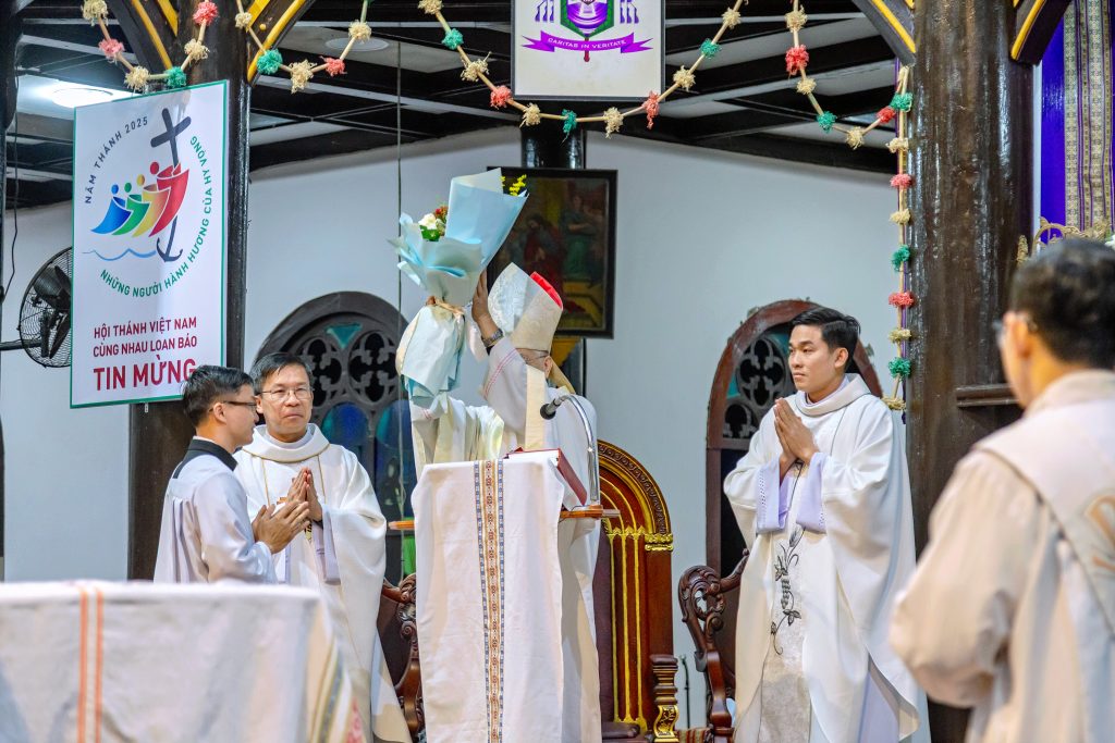 Cuối cùng, Cha Tổng thay mặt giáo phận gửi lời chúc mừng và hứa sẽ cầu nguyện nhiều cho Đức Cha, đồng thời trao tặng ngài bó hoa như biểu tượng của lòng yêu mến và biết ơn.