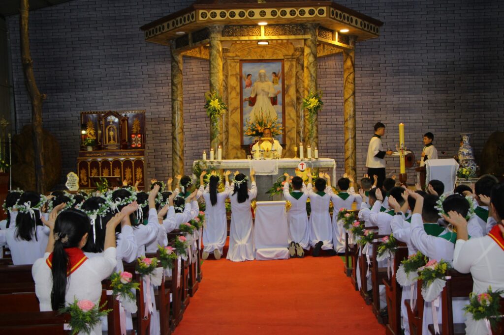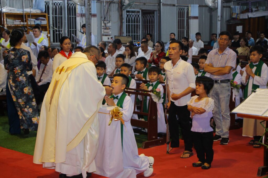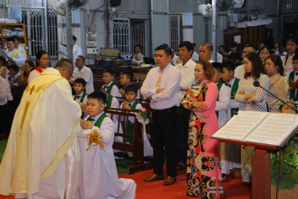 Đối với các em sắp lãnh nhận Mình và máu Thánh Chúa, cha đặc biệt dành một tình cảm ưu ái đặc biệt vì các em là những “mầm non tương lai” của giáo xứ. Cha chúc mừng các em sau một thời gian dài học hỏi và khát khao tìm kiếm Chúa, thì nay các em đã được rước Ngài cách xứng đáng vào tâm hồn. Cha cũng nói lên tầm quan trọng của Bí tích Thánh thể với các em, dặn dò các em phải luôn sống đúng với lứa tuổi và vai trò của mình, nhắc nhở các em về lòng biết ơn đối với Chúa, đối với ông bà cha mẹ, với quý Sơ, quý GLV-HT đã chăm lo dìu dắt các em.