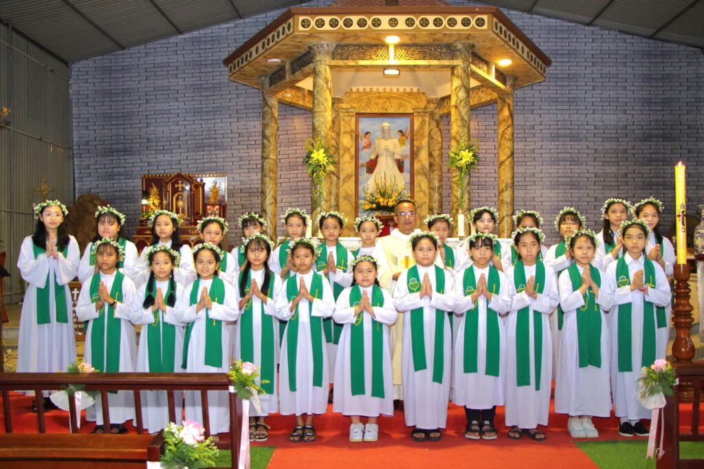Trước đó, các em được hướng dẫn dọn mình sốt sắng và đã lãnh nhận Bí tích Hòa giải, từ Cha chánh xứ Tađêô và Cha Luy Gonzaga Hoàng Vũ Tùng, CRM.