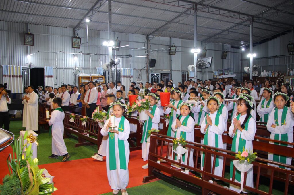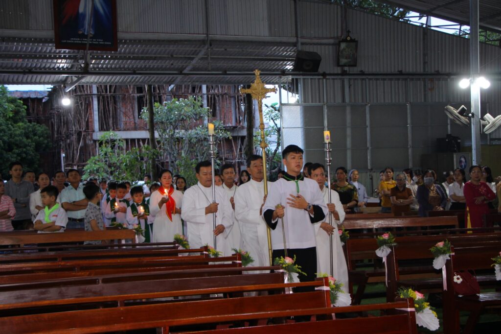 Thánh lễ bắt đầu với đoàn rước Cha chủ tế, quý phụ huynh và 44 em thiếu nhi trong đồng phục trang nghiêm tiến lên hướng về phía cung thánh, trong tiếng hát và niềm vui hân hoan của cộng đoàn.