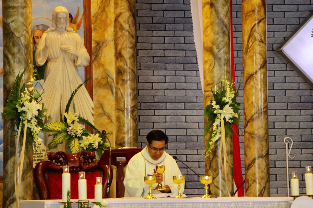 Tiếp đến, trong phần chia sẻ Lời Chúa, cha Gioan Baotixita nhấn mạnh ý nghĩa của Bí tích Thánh Thể là nơi ta gặp gỡ và giao hòa với Thiên Chúa, là lương thực nuôi sống linh hồn ta. Bên cạnh đó, cha mượn hình ảnh Chim bồ nông, loài chim biểu trưng cho tình yêu thương, cho lòng mẹ yêu con thắm thiết, cho sự hy sinh vô điều kiện – Hình ảnh con chim bồ nông làm chúng ta nghĩ đến tình yêu của Thánh Tâm Chúa Giêsu. Tin Mừng Thánh Gioan thuật lại “Một người lính lấy giáo đâm vào cạnh sườn Người. Tức thì, máu cùng nước chảy ra” (Ga 19,34). Từ đó, Cha nhắc nhở cộng đoàn, cách riêng là các bậc phụ huynh, về bổn phận giáo dục đức tin cho con cái, và đồng thời kêu mời các em thiếu nhi biết vâng lời, thảo kính cha mẹ như điều răn Chúa truyền dạy.