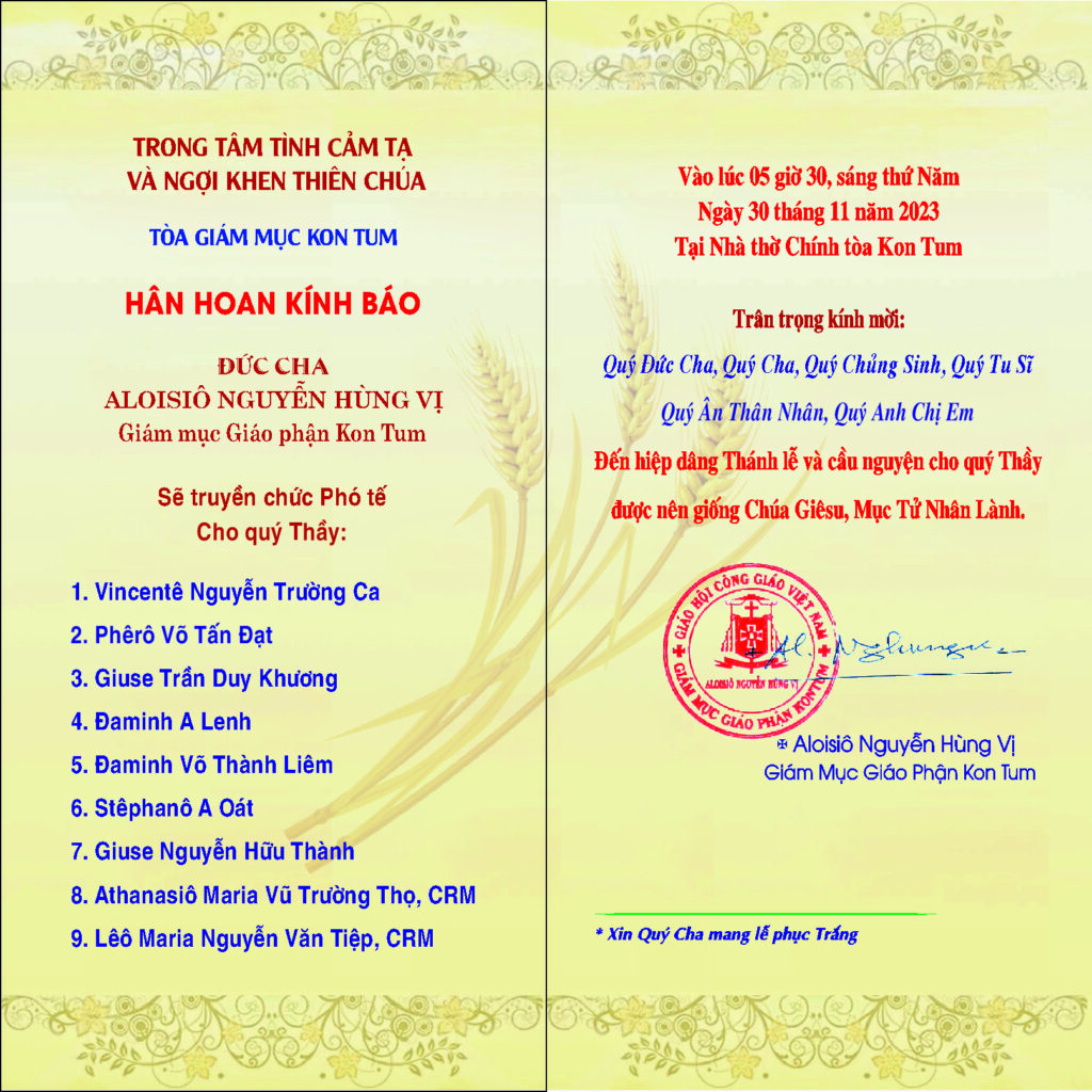 Trong tâm tình tạ ơn Thiên Chúa, Văn Phòng Tòa Giám Mục Kon Tum trân trọng kính báo, Đức Cha Aloisiô sẽ truyền chức Phó Tế cho quý Thầy có tên sau đây trong Thánh Lễ cử hành vào lúc 5g30’ Thứ Năm, ngày 30 tháng 11 năm 2023 tại Nhà thờ Chính Tòa Kon Tum: